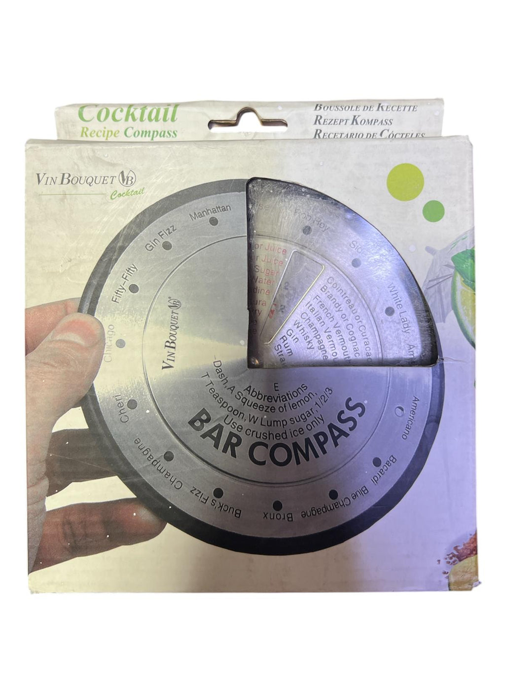 El bar compass es una herramienta práctica y elegante que funciona como guía de coctelería. Incluye un disco giratorio con recetas clásicas y medidas exactas para preparar una amplia variedad de cócteles de forma sencilla.